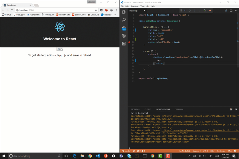 Debug in Chrome from inside VS Code. Pick a launch config from the dropdown on the Debug pane in Code, and press the play button or F5 to start.